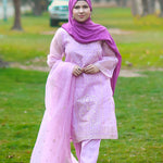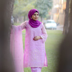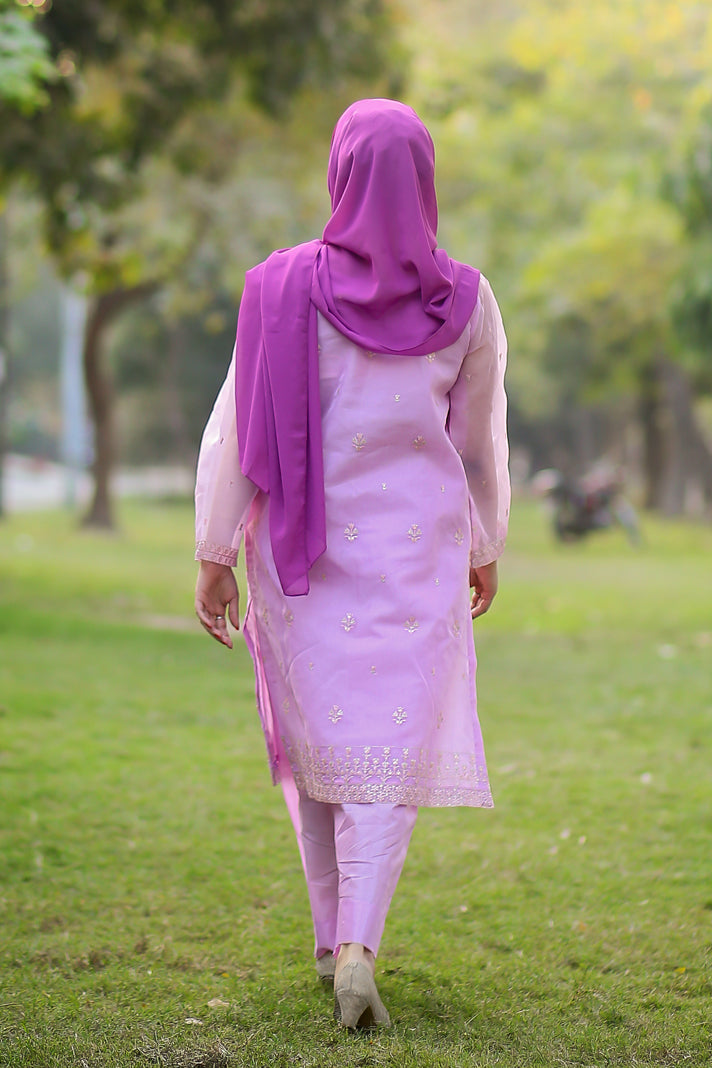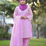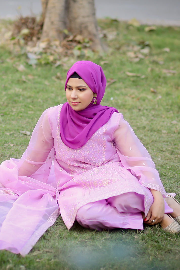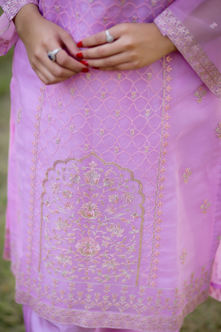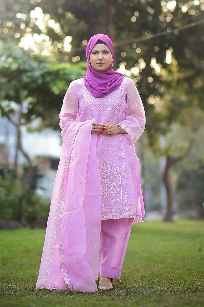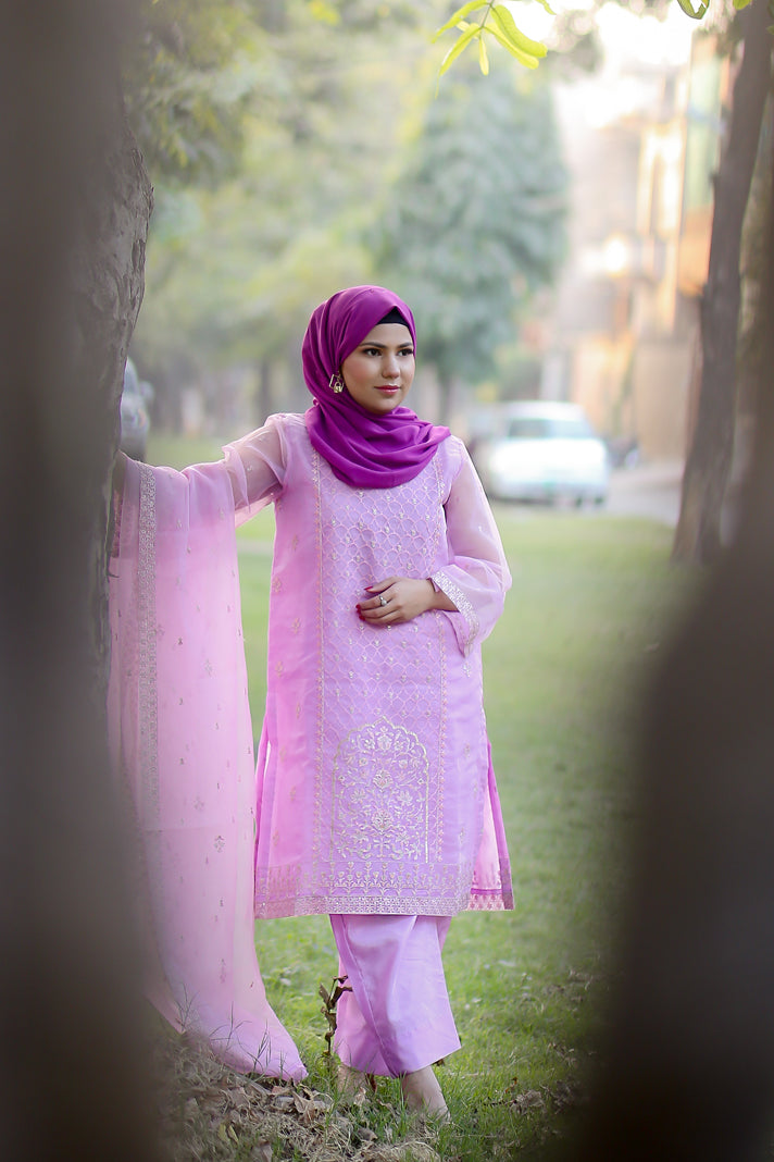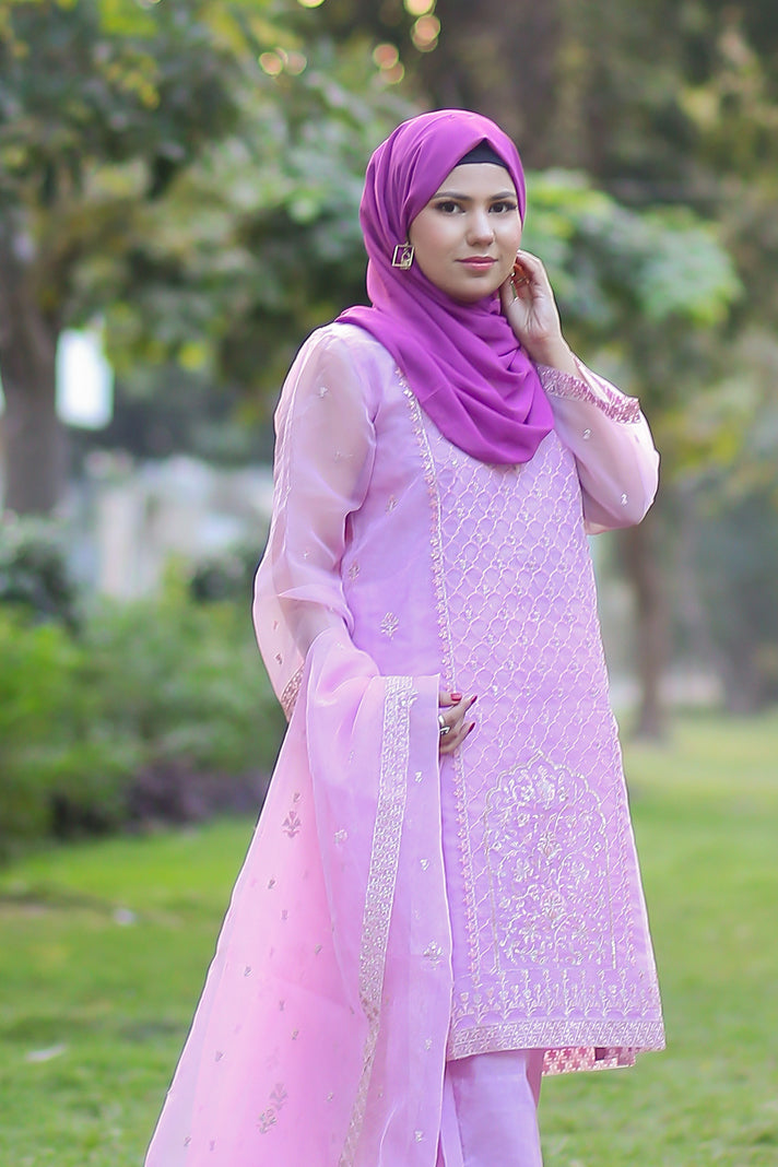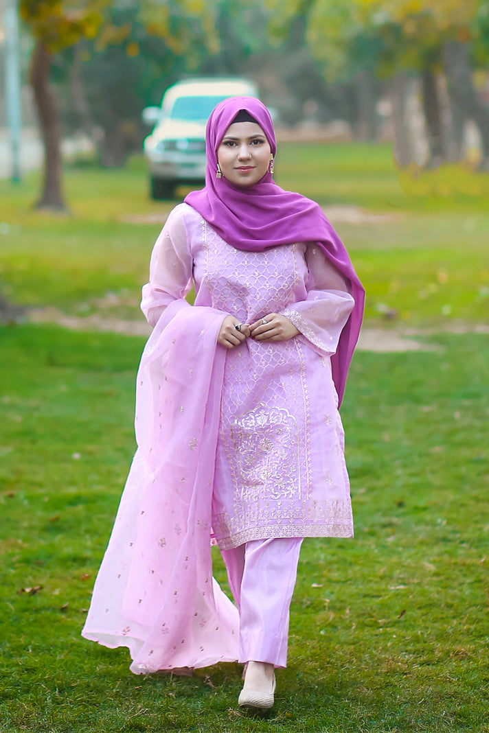 Elevate your wardrobe with this exquisite 3-piece embroidered ensemble in soft lavender. Crafted in delicate organza,
